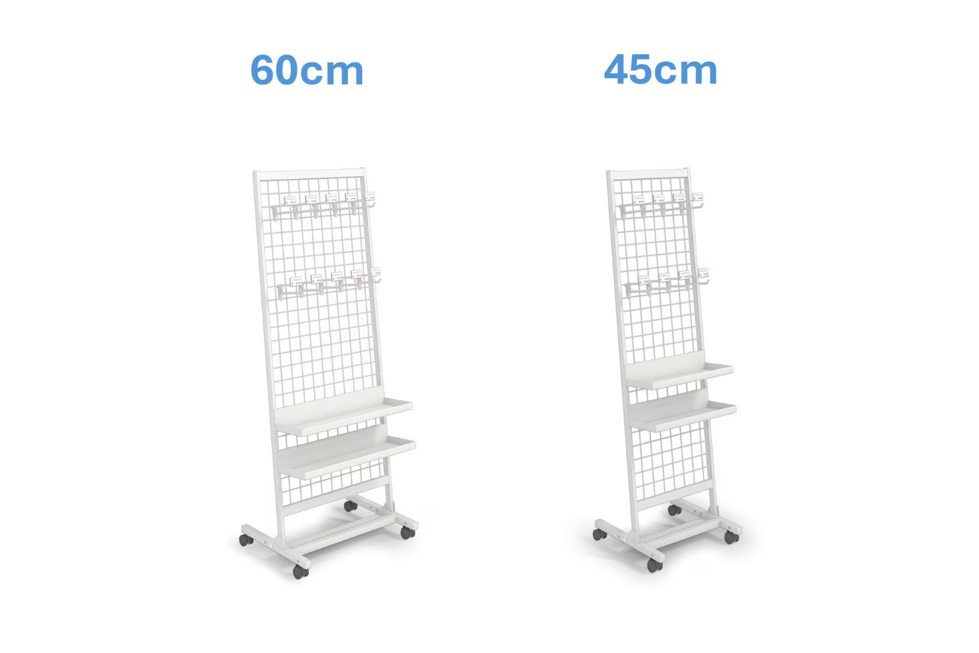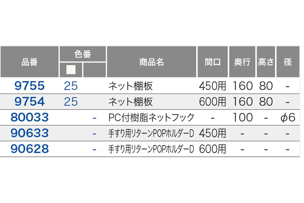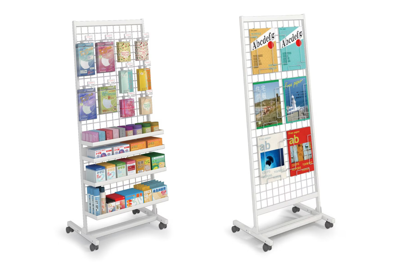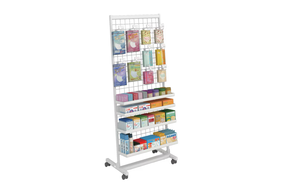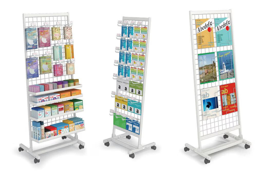無駄な機能を省き、シンプルなつくりです。棚板、フック、ブックスタンドなど基本的な陳列が行えます。