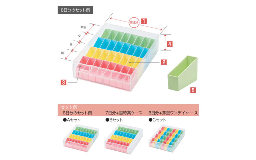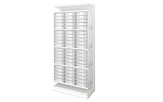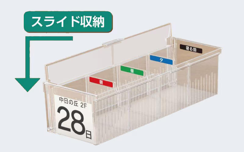 1患者1引出し方式で、7日~8日の処方を管理できます。4色の与薬ケースで、朝・昼・夕・眠前の与薬内容が一目で確認可能。1Week用・2Weeks用をはじめ、病床数に合わせたさまざまなタイプをご用意しています。カギ付きストッパーを標準装備。