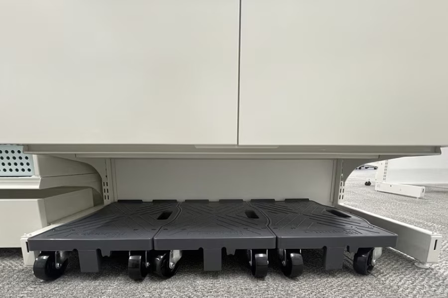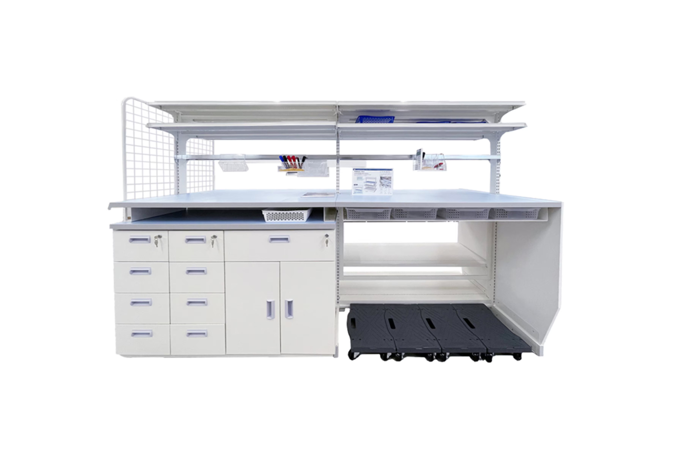 下部には台車収納可能なスペースもつくれます。液体系の重いものの管理などこちらで行うことで運び出しがらくらく。倉庫内に置く場合には、収納家具としても優秀です。