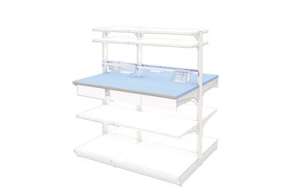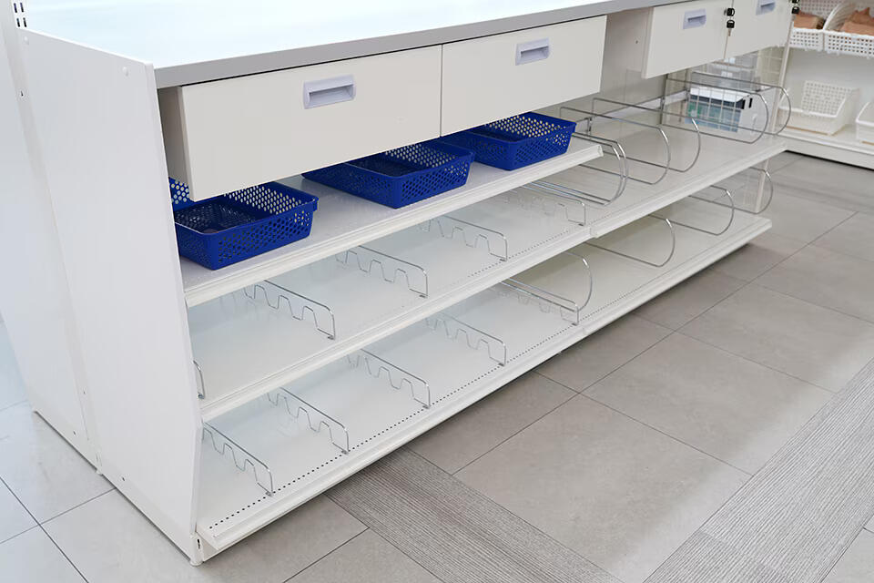 作業台の下に段ボール箱や、書類が乱雑に収納されていると、管理されずに調剤室内の収納を圧迫する原因になります。作業台の下や周りに収納スペースがあると、業務の効率がさらに向上します。書類や備品を整理整頓しやすいよう、引き出しや棚が豊富に配置された作業台を選ぶと良いでしょう。必要な物品がすぐに取り出せる位置にあることで、作業の流れが途切れることなく進みます。