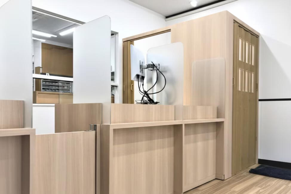 視線・音・距離を同時に遮断できるプライバシー性の高い対策です。新設薬局や全面改装時に採用されることが多く、独立しており安心できる空間で相談品質を向上させます。一方で完全個室では無い為音漏れは完全には防ぐことは難しいです。また待合室スペースを広く取ってしまうデメリットもあります。他にも、カウンターの1か所だけに個室を設ける場合には逆に周囲の目についてしまい、心理的に嫌な患者様も少なくありません。