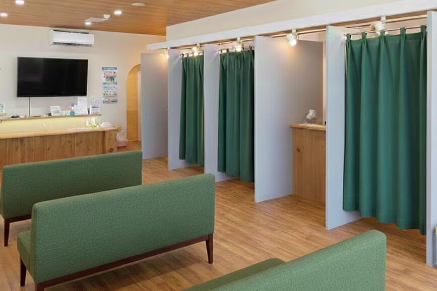 カウンター周辺にカーテンを設置し、必要時のみ空間を区切る対策です。低コストかつ柔軟性が高く、小規模薬局でも導入しやすい方法です。店舗デザインへ与える影響が高いこと、防音性は低いことがデメリットとしてはあります。