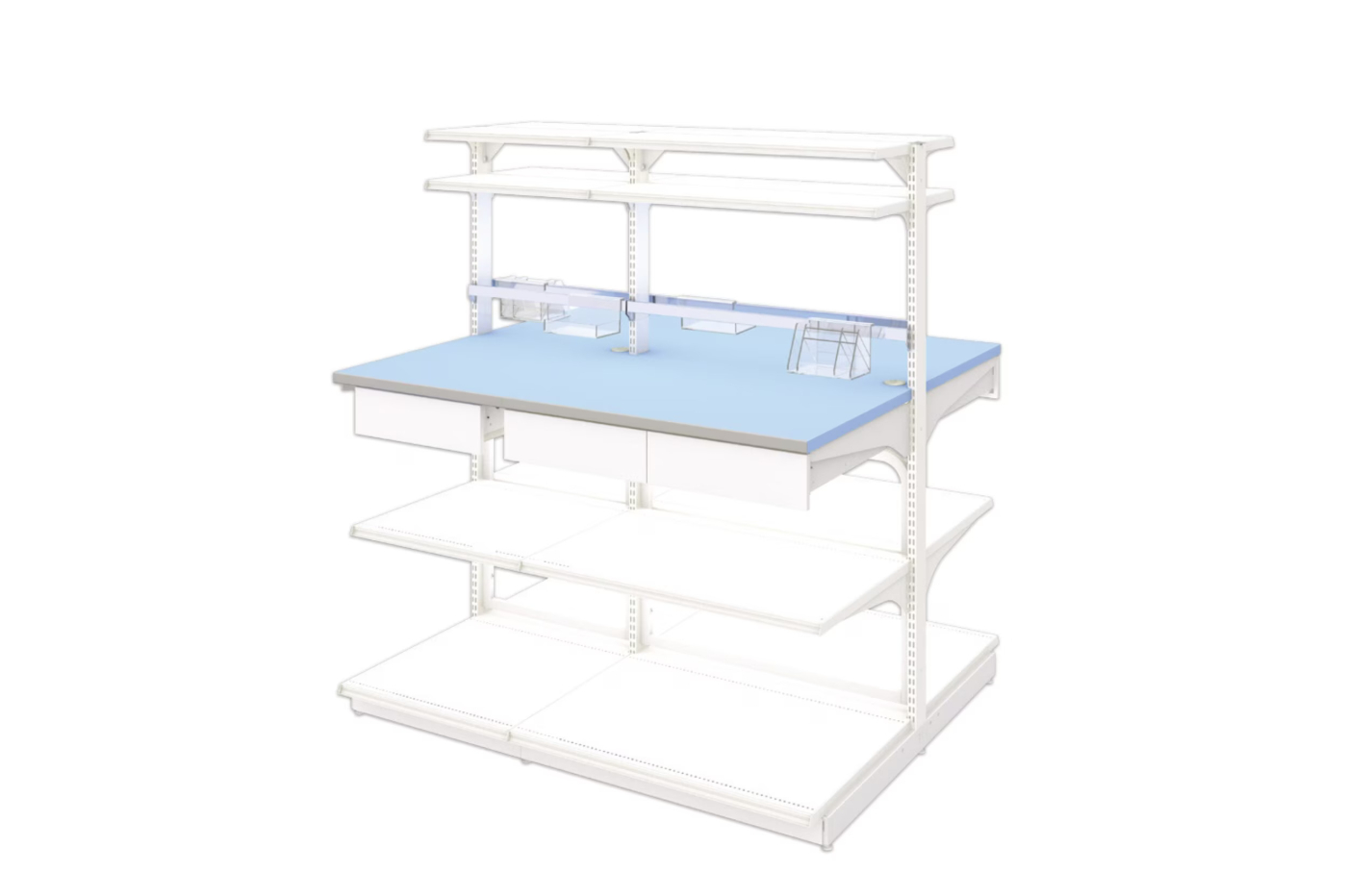 さらにDPS調剤棚なら、棚の位置を自由にカスタマイズ可能。例えば、軟膏練り機を天板に設置するために棚の枚数を減らすこともできます。