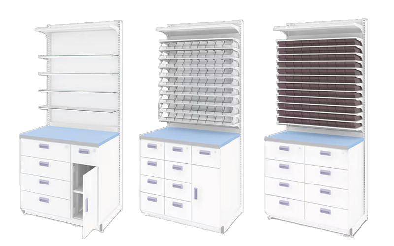 シリーズで揃えることで収納スペースを最大限に活用でき、無駄なスペースが少ない効率的な調剤室環境に。