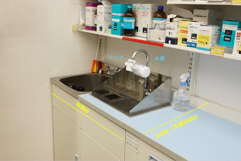 事務スペースや漢方台も同様に「DPSシリーズ」で統一されています。