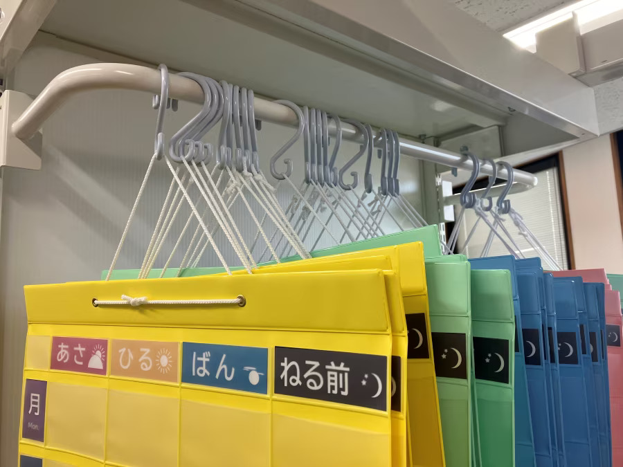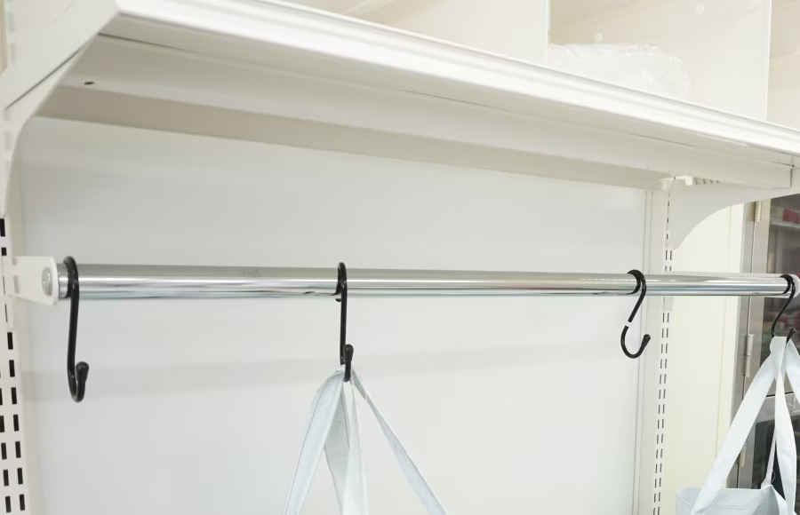 「UL什器」ならハンガーラックの取り付けも可能です。在宅薬局ではカレンダーの置き場に困るなんてこともあると思います。このようにハンガーラックを取り付け、カレンダーをかけることで浮かした収納もできます。カレンダー収納の下にスライドテーブルをつけるとその場での作業も可能になり効率的な使い方が可能です。