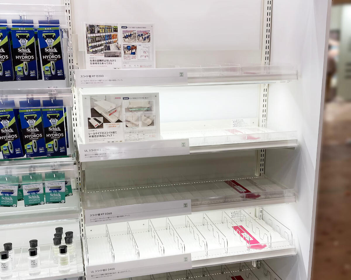 また、先入れ先出し作業をスムーズに行うことができる「スライド棚」も省力化をサポートします。