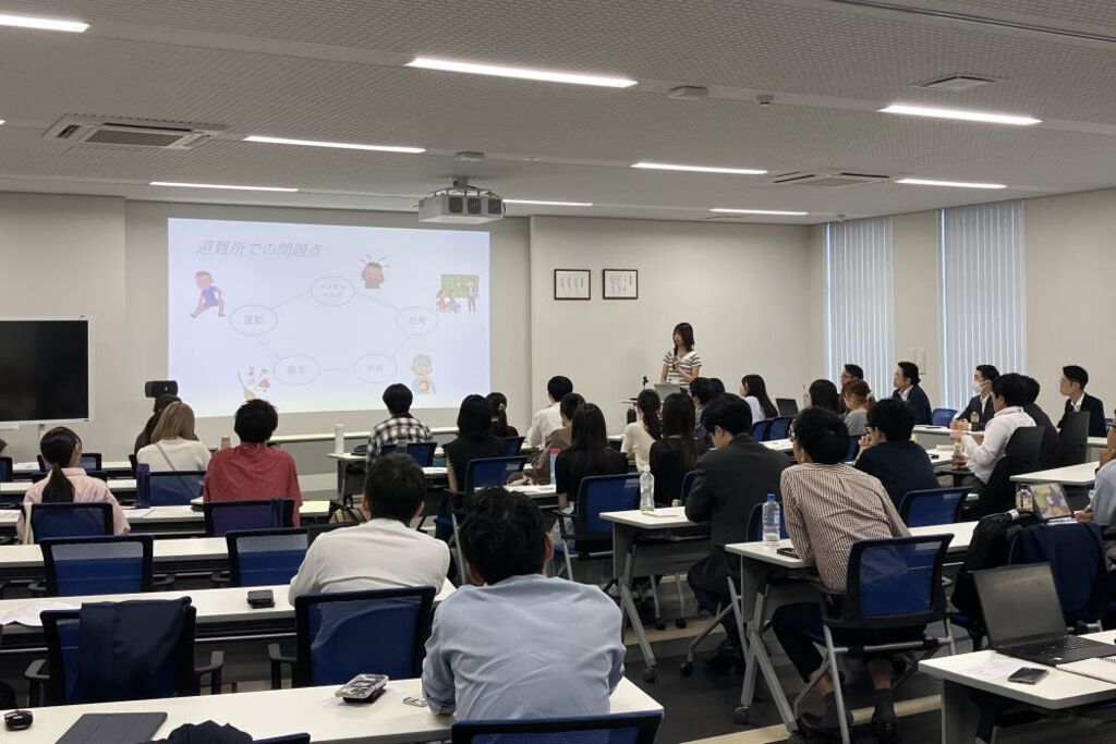 授業には薬学部3年生約20名が参加。学生たちは初日当社ショールームを訪れ、実際に薬局で使用される設備や什器を見学し、限られたスペースの中でどのように薬局機能を確保できるかを検討しました。2日目は瑞穂消防署にて、救急医療や減災対応の現場を学び、災害時に薬剤師がどのように地域と連携し支援できるかを考察。最終日には中日販売本社会議室にて、これまでの学びをもとに学生たちがグループごとに発表を実施。避難所での薬局機能や健康支援のアイデアをプレゼンテーションしました。段ボール製の調剤台や個室ブースを活用した健康相談の提案など、現実的かつ創造的な発想が多く見られました。