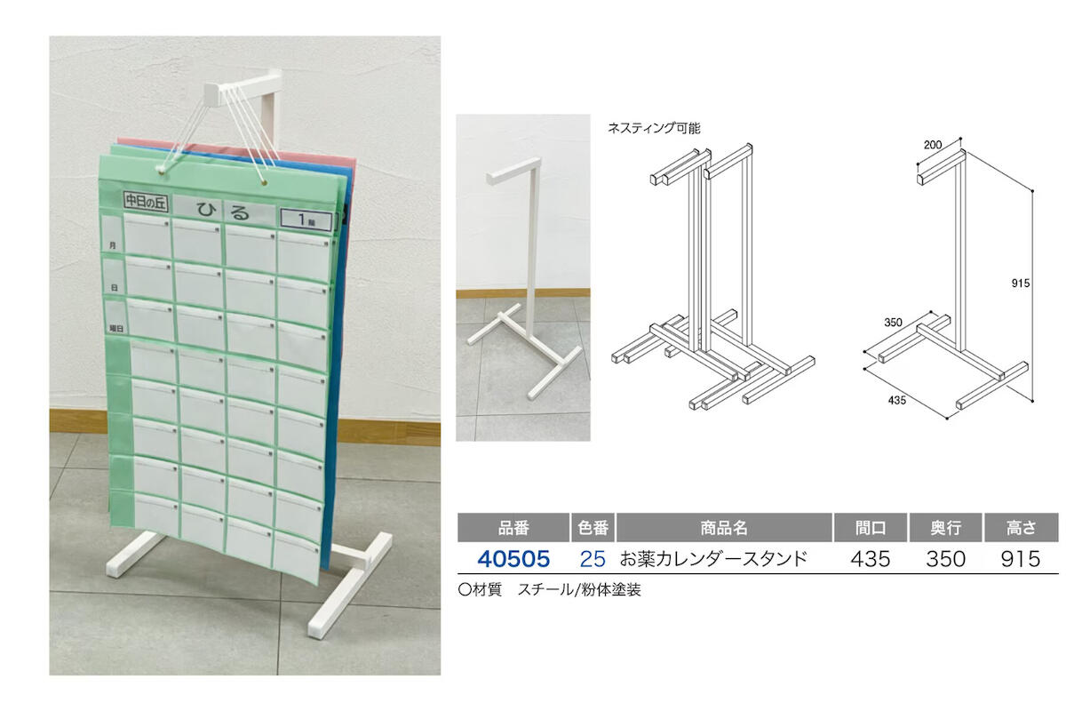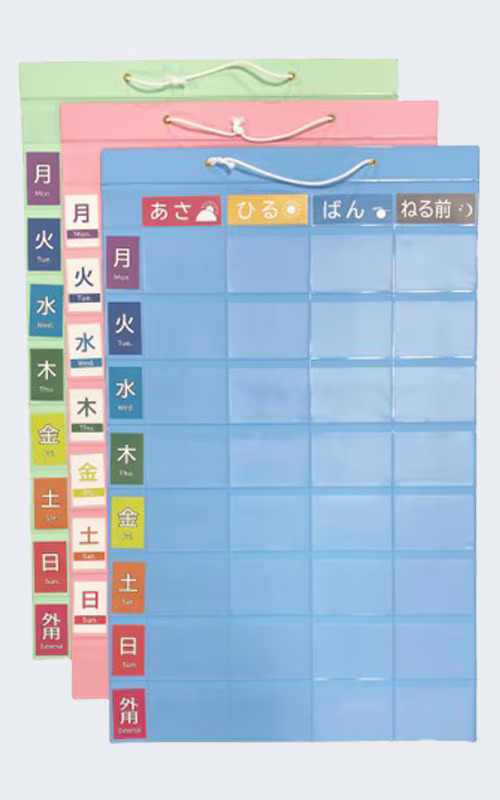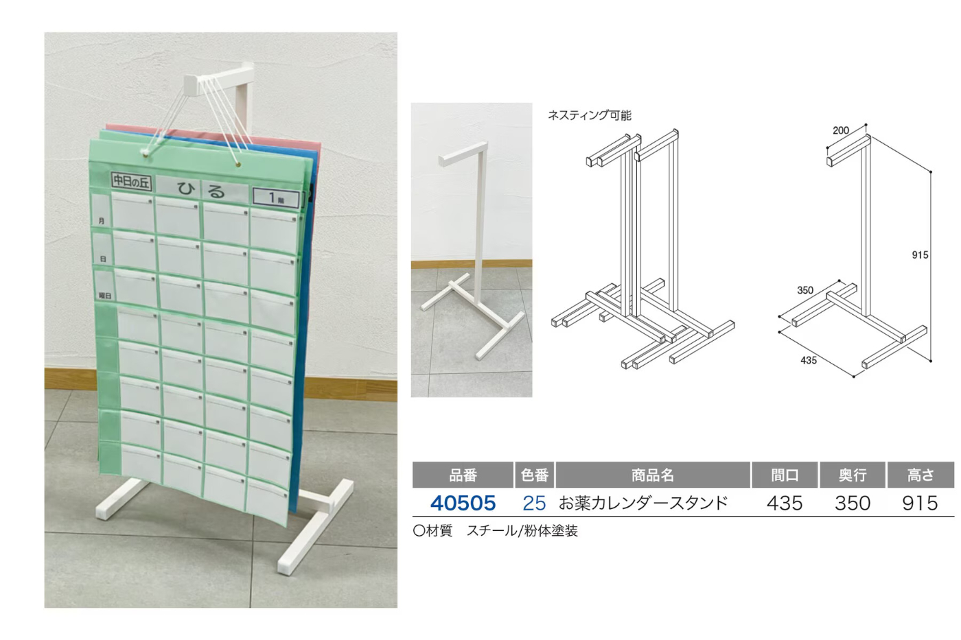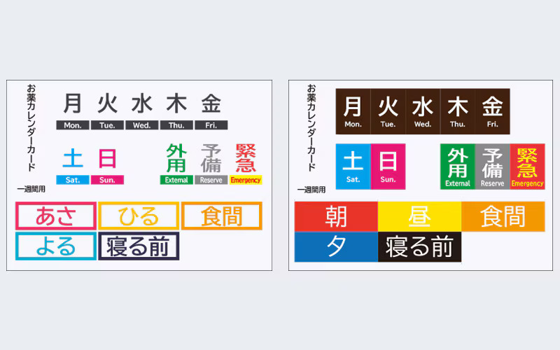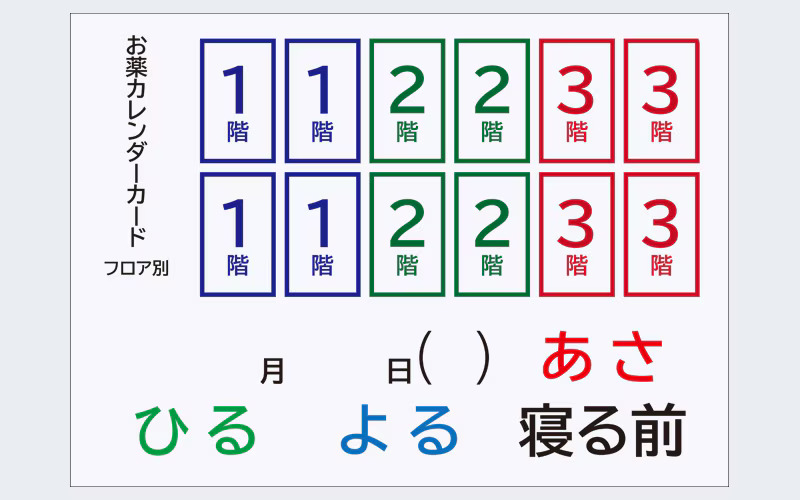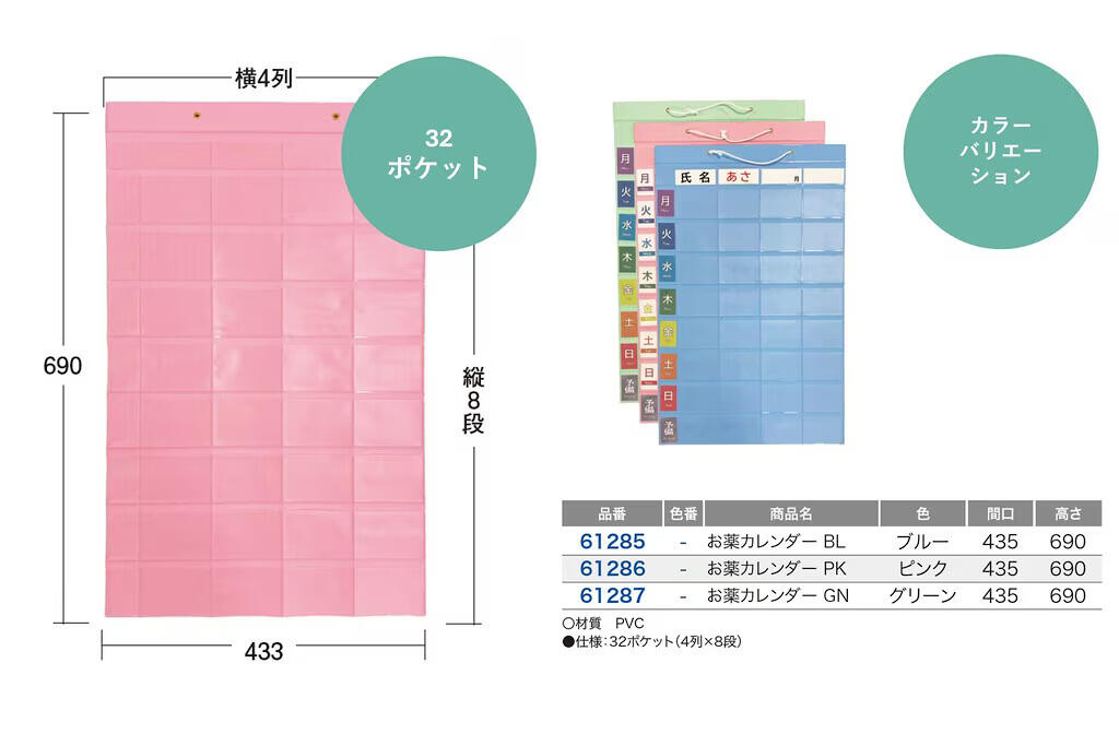 製品特長 FEATURE POINT 基本的なカードデザインはご用意しております。ダウンロードはこちらから POINT カードデザインはカスタマイズ製作も可能 POINT 施設やフロアごとも使い分けできる3色展開 仕様・サイズ SIZE 薬を分かりやすく整理することで誤薬の軽減や配薬確認も簡単になります。1週間に+1した8段で使い方が多様になりました。●寸法:W433×H690●仕様:32ポケット(4列×8段)●カラー:3色(ブルー/ピンク/グリーン)●材質:PVC オプション品 OPTION お薬カレンダースタンド その他の製品 PRODUCT DPS多機能作業台・監査台 作業台上置きスリット DPS調剤棚(箱型) ポケット付きディバイドレール DP作業台 DP監査台 与薬ケース・バスケットラック 分包機組込台 DPS手動式スライドユニット 与薬ケース DPSクリーンベンチ チョイカケベンチ OTC・木棚ユニット Fスタンドネット ファシリスカウンター DP木製カウンター