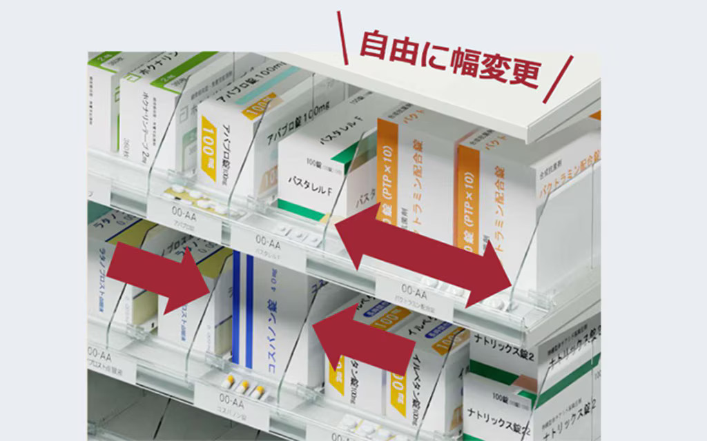 箱サイズ、在庫量に合わせて自由に収納スペースを変更でます。無駄なスペースの削減にお役立ていただけます。