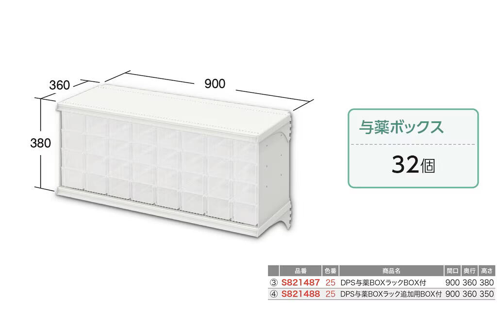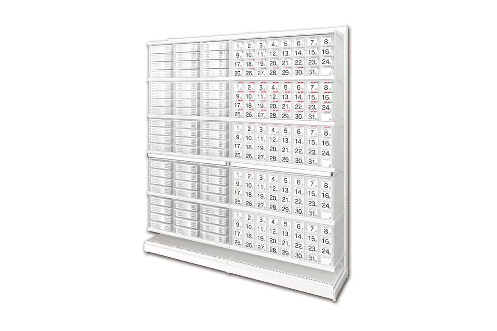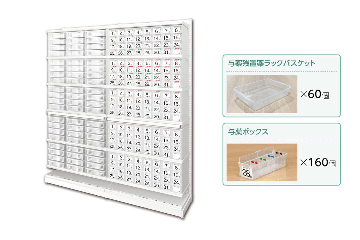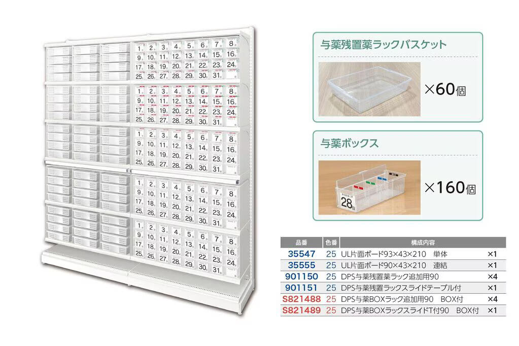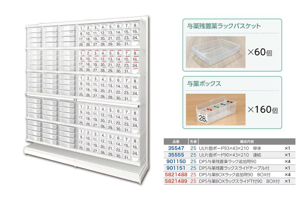 バスケット・カゴは本体最大60個、与薬ボックスは最大160個収納可能です。段数で分けて取付も可能で、使用用途に合わせてお使い頂けます。