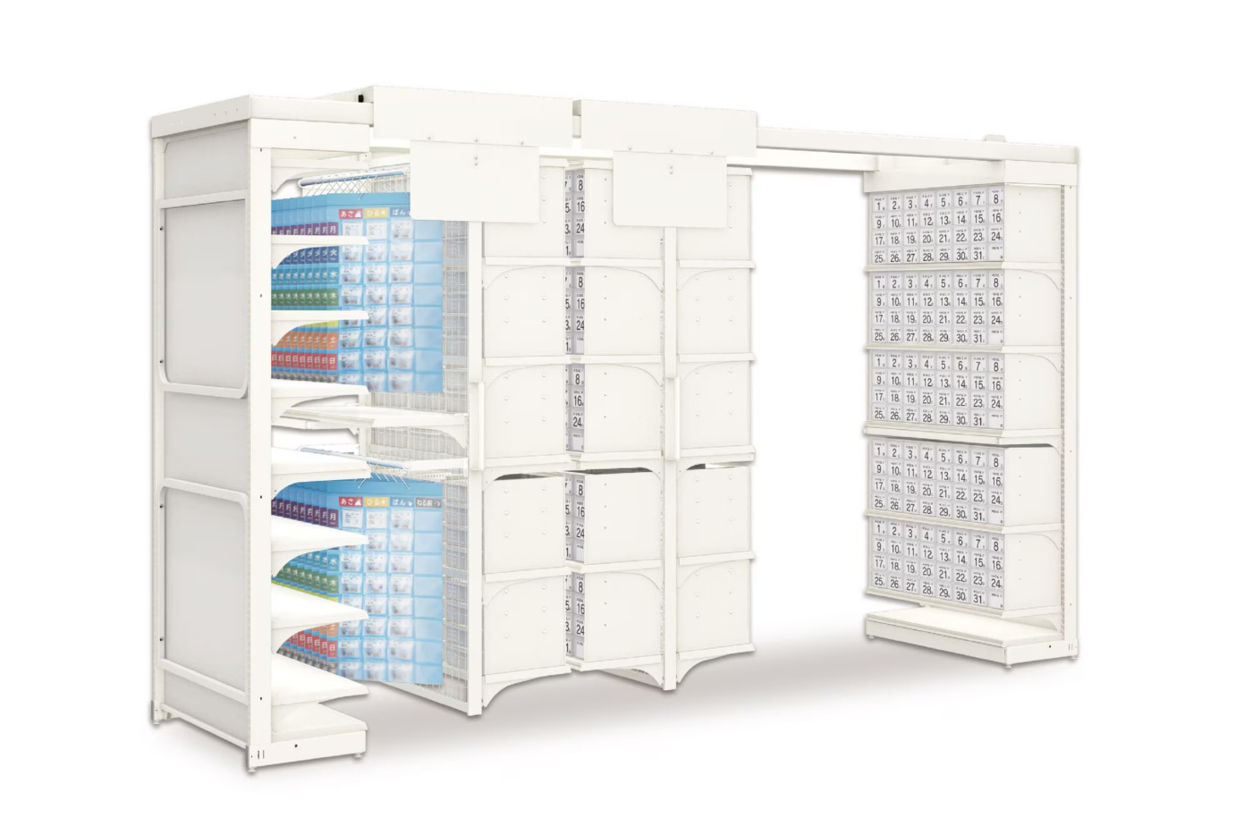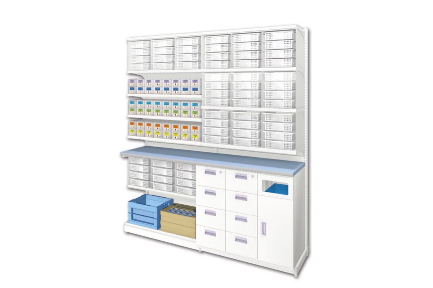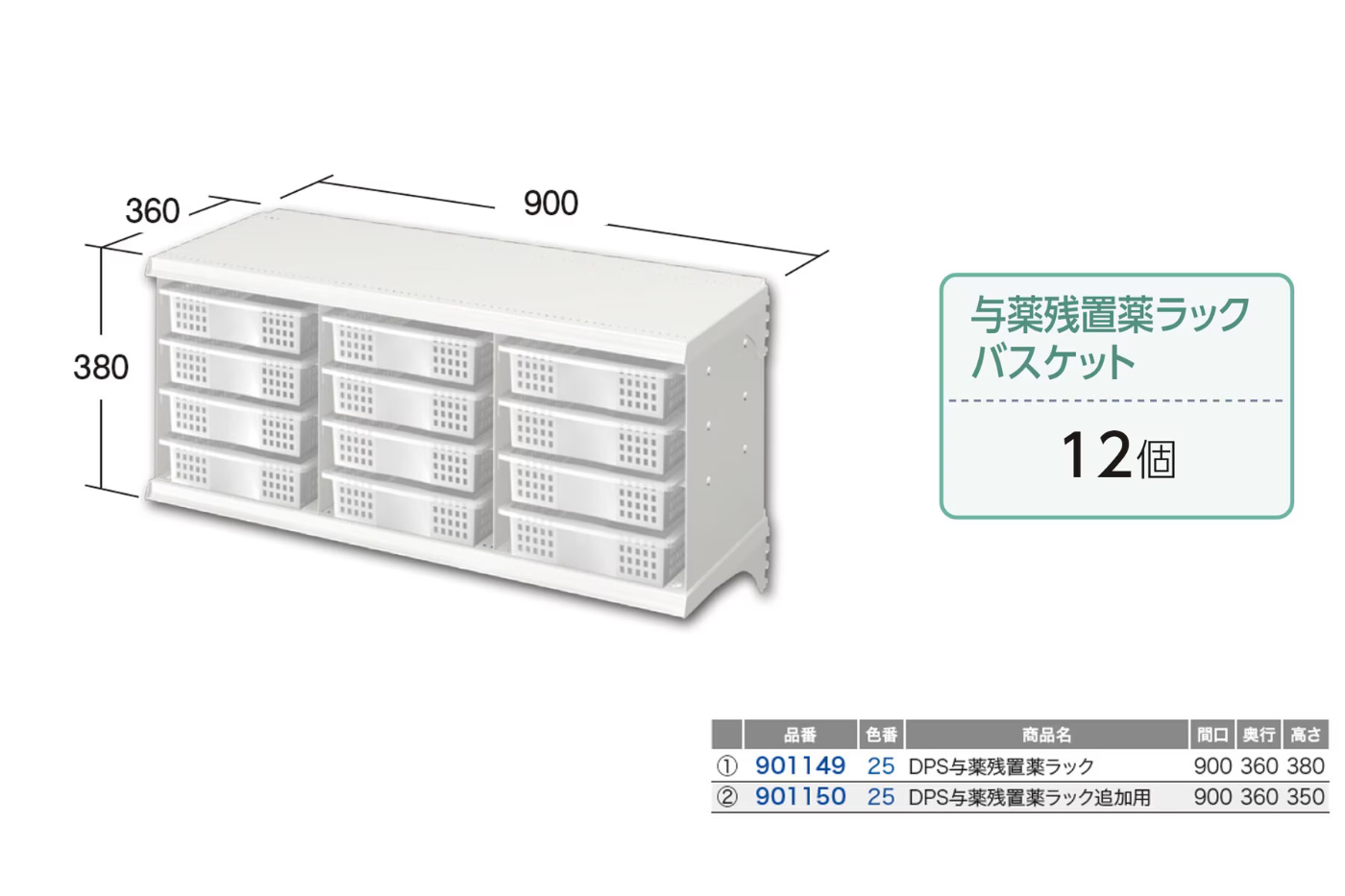 バスケット・カゴは本体最大60個、与薬ボックスは最大160個収納可能です。段数で分けて取付も可能で、使用用途に合わせてお使い頂けます。
