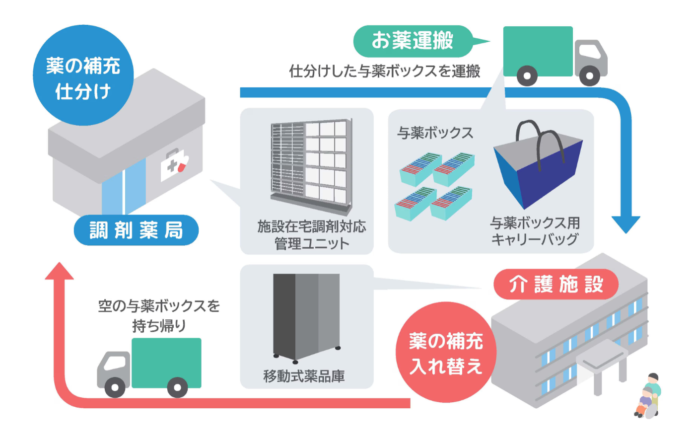 介護施設に対してもお薬管理製品を提案します。薬局と施設が共通のアイテムでお薬を管理することで、より効率が良い配薬オペレーションを実現します。「薬局」「施設」「個人宅」といった全ての場面において使いやすさを考慮しています。
