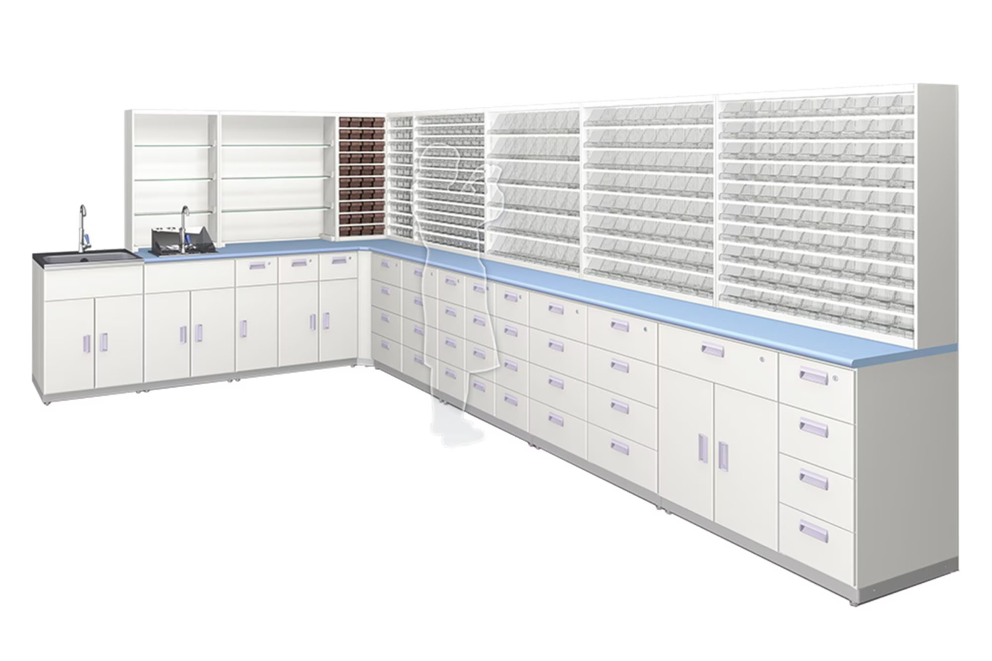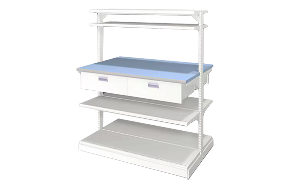 薬局のコンセプト、内装デザインに合わせて、オーダーメイドの陳列棚の製作も可能です。豊富な既製品ラインナップと組合せることで機能性の高い陳列棚をご提案します。