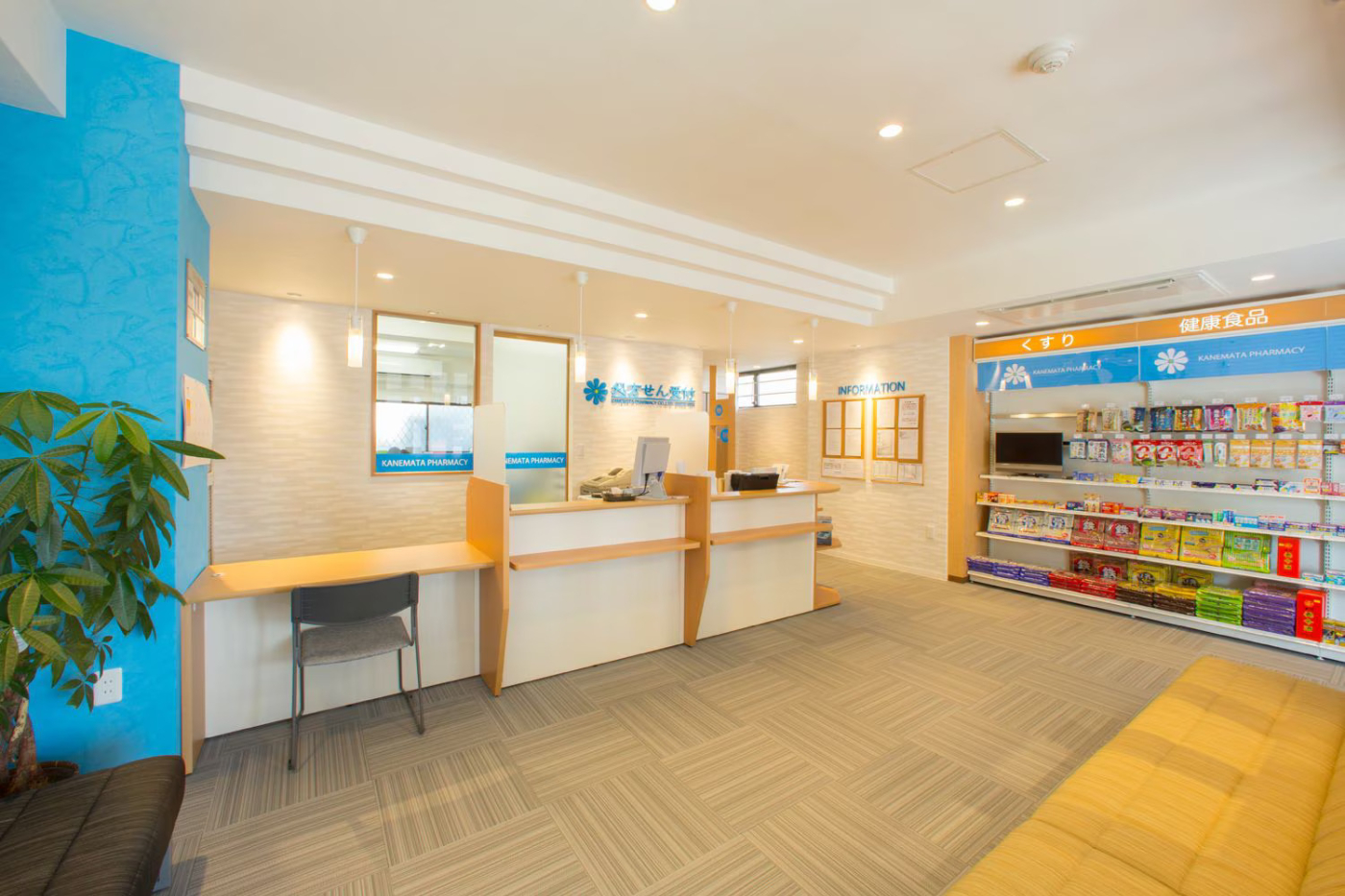 カウンターや物販棚の製品も取り扱っております。さらに、待合室の空間デザインから、内装工事に至るまで、包括的なサービスをワンストップでご提供します。